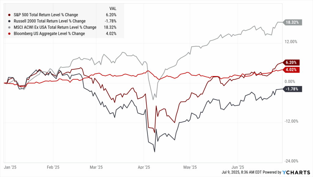 The first half of 2025 has been anything but boring. Stocks, as measured by the S&P 500 Index, rose through the first six weeks of the year, closing at an all-time high on February 19th. The ensuing six weeks can then be characterized by tariff chaos as the Trump Administration gradually rolled out new tariff rates, creating uncertainty in the financial markets.