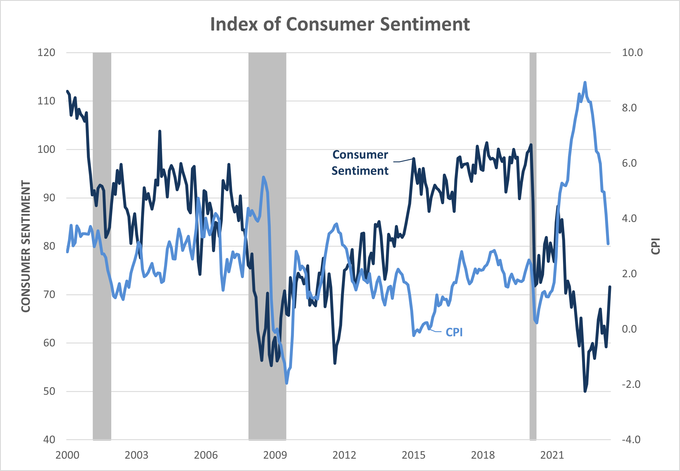 The University of Michigan’s Consumer Sentiment Index has tracked inflation over the past eighteen months. Last year, as inflation continued to rise and recession fears increased, many consumers felt worse about their own and the economy’s prospects. Coincidently, the index bottomed in June 2022, the same month inflation peaked at 9.1%. Since then, inflation has slowed, and consumers have become more optimistic each month.
